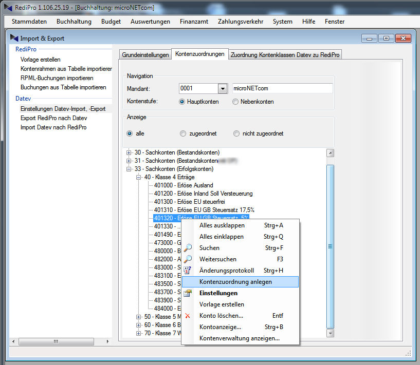 RediPro© bietet Ihnen darüber hinaus jedoch noch weiteren Mehrwert. Die Im- oder Exporte können gerichtet sein. Das bedeutet folgendes: Sie können die Buchungen von vielen Konten in RediPro© auf ein Konto in Datev oder von vielen Konten von Datev auf eine Konto in RediPro© übertragen. Datev benötigt oft gar nicht die hohen Differenzierungen, wie sie in RediPro möglich sind. Aus Sicht des Steuerberaters ist das oft gar nicht erwünscht.