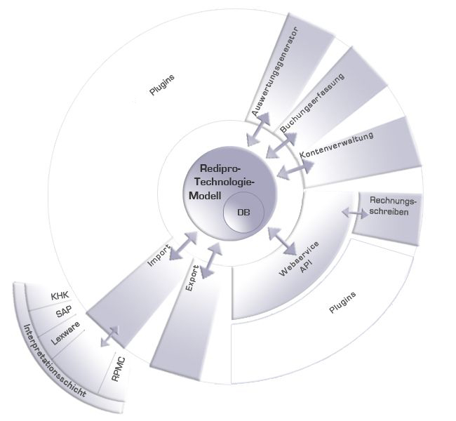 RediPro© verfolgt die Idee der Serviceorientierten Architektur. Damit können Anwendungen fast beliebig zusammengestellt und kombiniert werden. Zusätzliche Funktionen können mühelos integriert und vorhandene ausgetauscht werden. Die einhergehende Modularisierung sorgt für die Kapselung von Funktionen und damit der besseren Überprüfbarkeit und letztendlich höherer Qualität und Verlässlichkeit.