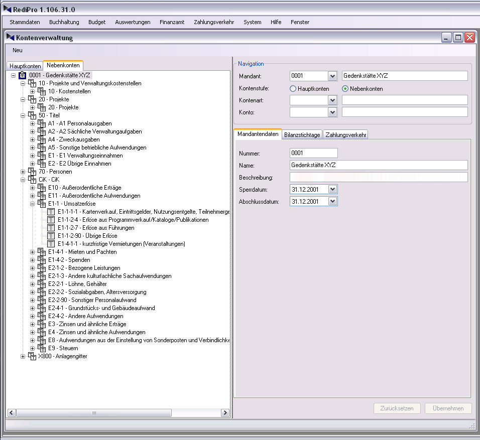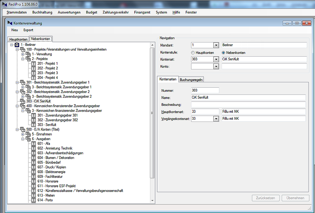 Mit RediPro bilden Sie auf eine sehr einfache Weise alle semantischen Anforderungen der Zuwendungsgeber (Berichtssystematiken) in einem einzigen (homogenen) System so ab, dass die Werte in Zeilen und Spalten darstellbar sind. Dadurch haben Sie stets die volle Beweiskraft der doppelten Buchführung und stets garantiert konsistente Daten. Auch dann, wenn Sie gar keine doppelte Buchführung erstellen müssen oder wollen, haben Sie die Beweiskraft der doppelten Buchführung mit RediPro. In diesem Fall existiert neben den Geldkonten nur ein einziges doppeltes Konto, das im Hintergrund (für Sie fast gar nicht wahrnehmbar) automatisch gebucht wird – aber jederzeit mit wenigen Handgriffen in ein vollständiges doppisches System umgestellt werden kann.